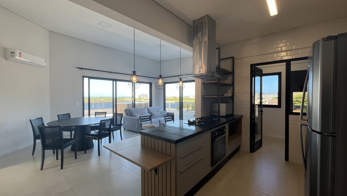 A sala é espaçosa, com integração total aos ambientes e perfeita para quem valoriza liberdade e bem-estar. O terraço é um espetáculo à parte: livre, amplo e com uma vista panorâmica para o mar, a Lagoinha Pequena e o Morro do Lampião, um verdadeiro mirante natural, onde você pode ver o sol nascer e apreciar um pôr do sol incrível.